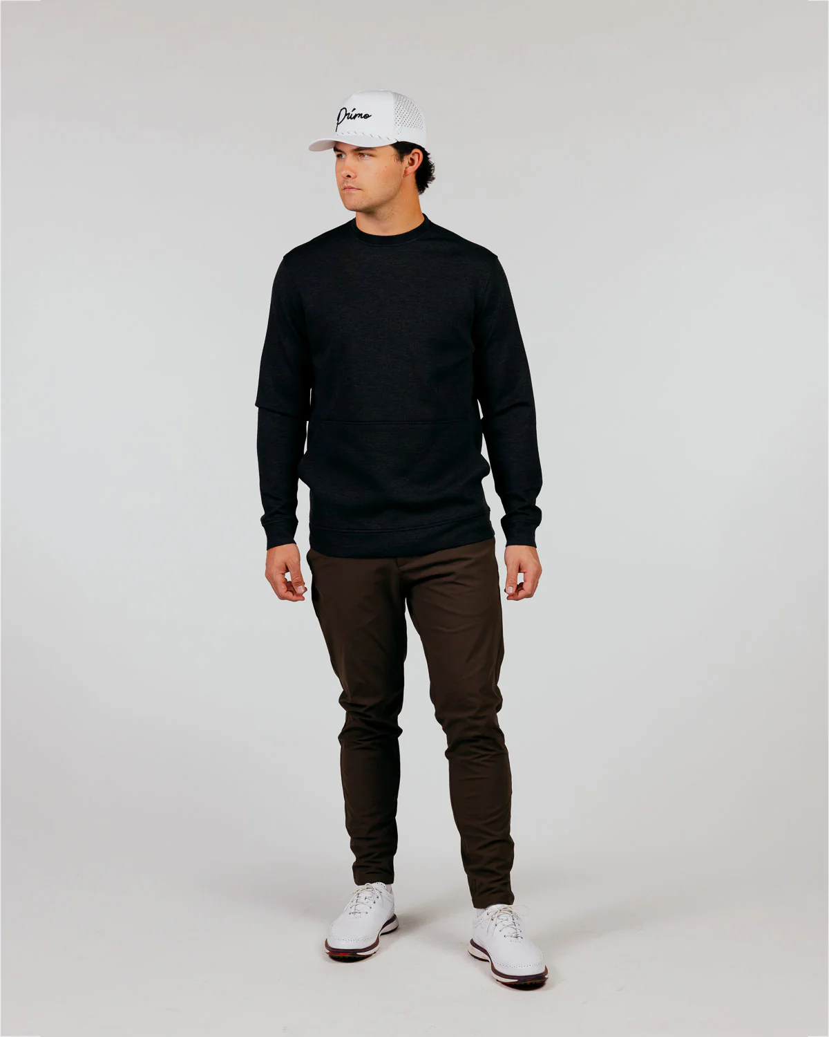 A tailored neckline and modern athletic fit create a polished look that layers effortlessly over your favorite polo, making it equally suited for the fairway, the clubhouse, or everyday wear. Signature shoulder logo placements featuring the Primo cursive mark add a subtle elevated touch, while the full-width kangaroo pocket brings warmth and function with a refined twist on classic comfort.